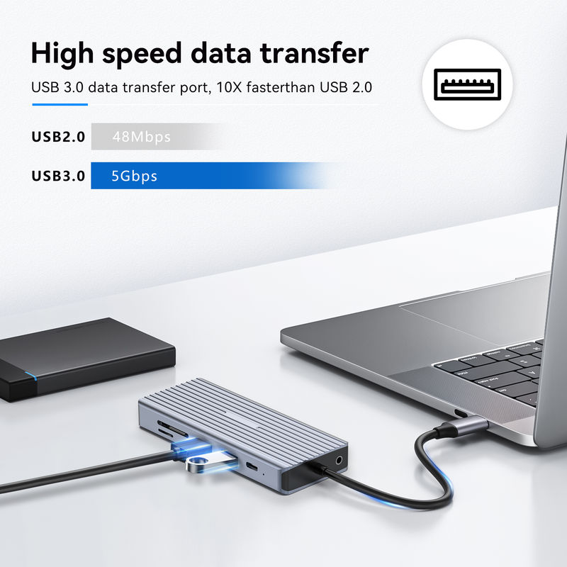 Equipped with PD transport capabilities of up to 100W, this USB C Hub offers rapid charging for compatible devices, ensuring quick and efficient power delivery whenever needed. This feature is especially useful for users who require fast charging for their devices to stay productive throughout the day.